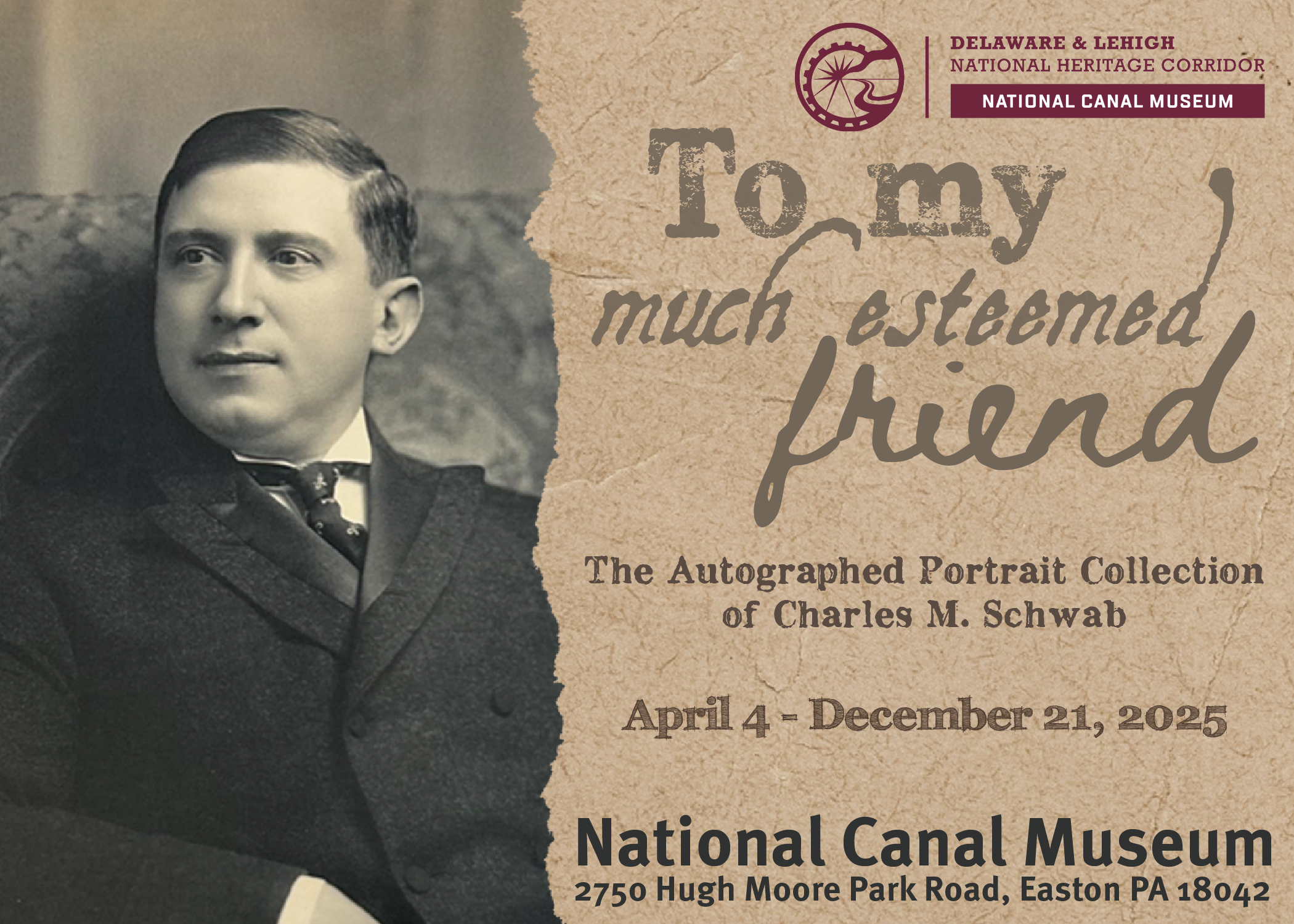 “To My Much Esteemed Friend ….” The Autographed Portrait Collection of Charles M. Schwab opened on April 5, 2025, at Delaware & Lehigh National Heritage Corridor’s (DLNHC) National Canal Museum in Hugh Moore Park, Easton PA. The autographed photographic portraits in this collection were presented to Schwab, the business genius who built and led Bethlehem Steel from 1905 until the mid-1920s, by the powerful, prominent, and famous people who filled his world. The exhibition will be the first public display of the collection since the 1980s.